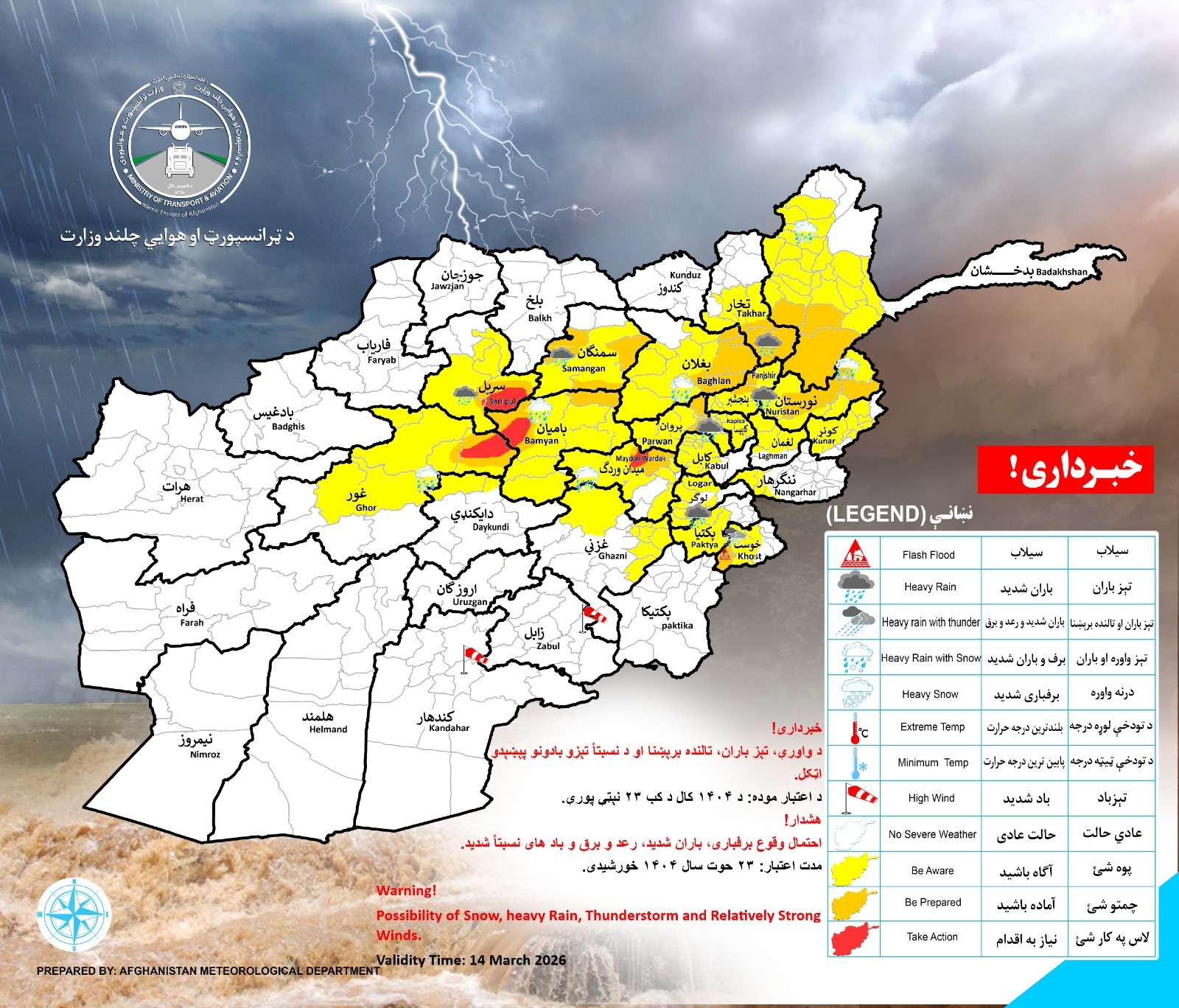 احتمال بارش شدید برف و باران و وزش بادهای نسبتاً شدید در ۲۱ ولایت کشور وجود دارد