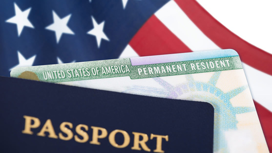 United States of America permanent resident card, green card, displayed with a US flag in the background and a passport in the foreground. Immigration concept.
