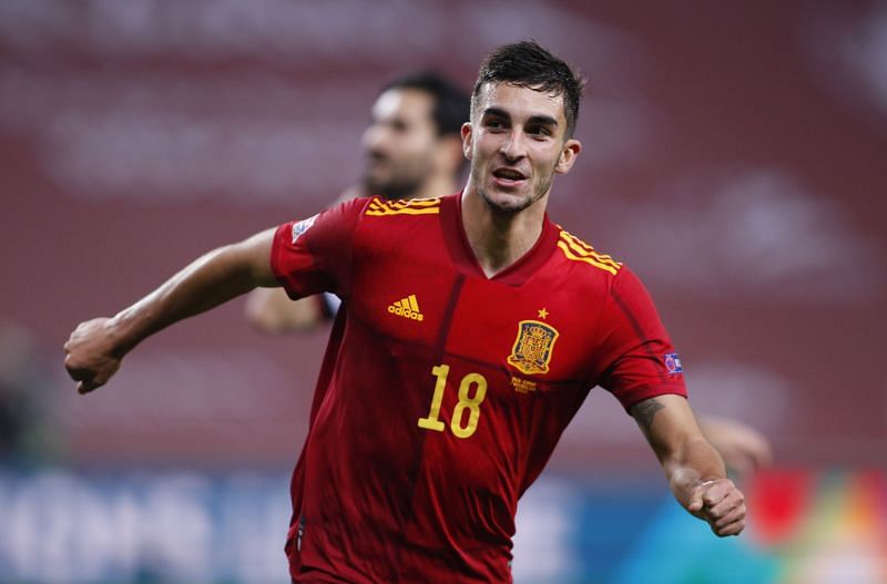 Celebrate scores of Ferran Torres of Spain during the UEFA Nations league match between Spain and Germany at the la Cartuja Stadium on November 17, 2020 in Sevilla Spain