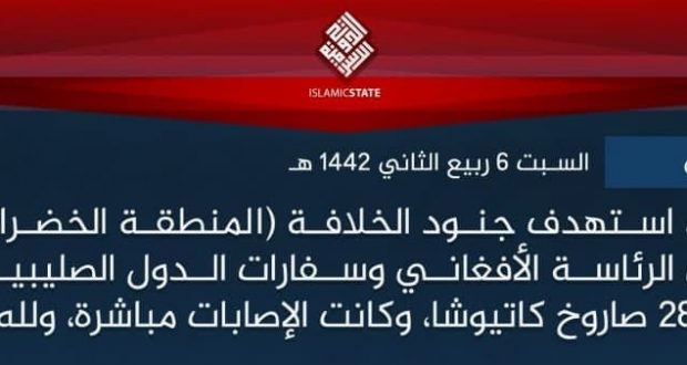 یکشنبه2قوس1399: گروه داعش مسوولیت حملات راکتی روز شنبه اول قوس به شهر کابل را برعهده گرفت. این گروه امروز با صدور بیانیهای اعلام کرد حملات راکتی به مناطق مختلف شهر کابل کار این گروه بوده است. در بیانیه آمده است که 28 فیر ...