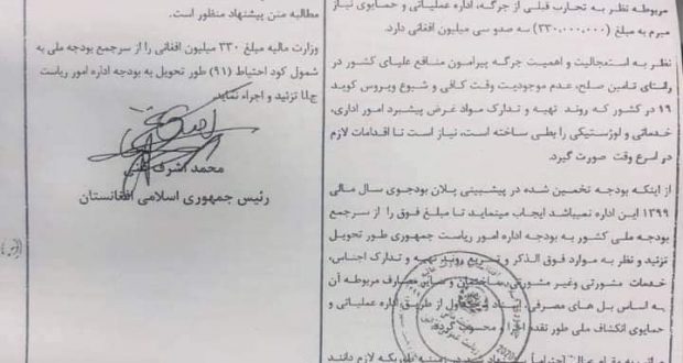 پنجشنبه16اسد1399: محمد اشرف غنی رییس جمهور کشور به وزارت مالیه دستور داده است که 330 ملیون افغانی را بخاطر برگزاری لویه جرگه مشورتی در اختیار اداره امور ریاست جمهوری قرار دهد. در پیشنهادی که توسط اداره حمایتی و عملیاتی ریاست ...
