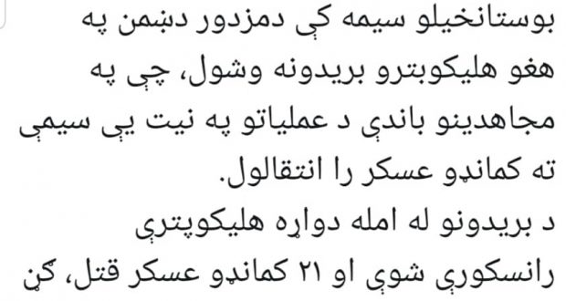 د طالبانو ویاند ذبیح الله مجاهد پر خپل ټوېټر پاڼه کې لیکلي، د بریدونو له امله دواړه چورلکې رانسکورې شوې او ۲۱ کمانډو عسکر پکې وژل شوي او ګڼ نور ژوبل دي.