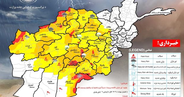 د هوا پېژندنې ادارې په یوه اعلامیه کې ویلي چې په غور، هلمند، کندهار، زابل، ارزګان، دایکندي، غزني، پکتیکا، پکتیا، لوګر، میدان وردګ، پروان، بغلان، پنجشیر، کاپیسا، کابل او سالنګونو کې واورې، بارانونه او تېز بادونه وشي.