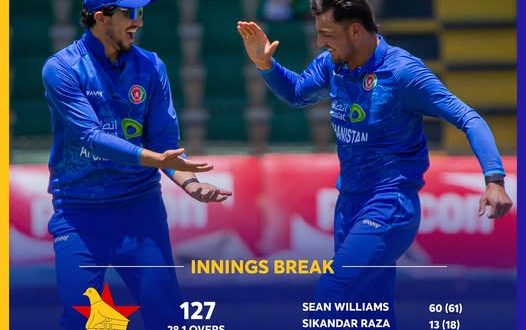 د افغانستان او زمبابوې کرکټ ملي لوبډلو ترمنځ په دریمه نړیواله یو ورځنۍ لوبه کې زمبابوې لوبډلې په خپله پاڼۍ کې د ټولو لوبغاړو په زیان سره افغان لوبډلې ته د ۱۲۸ منډو هدف وټاکه.