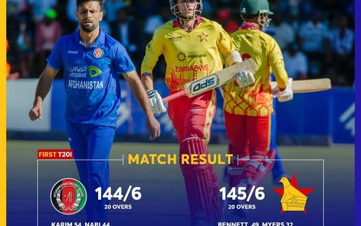 د افغانستان او زمبابوې کرکټ ملي لوبډلو ترمنځ د پیل شوې لوبلړۍ په لومړۍ لوبه کې افغان ملي لوبډلې زمبابوې ته د ۱۴۵ منډو هدف وټاکه.